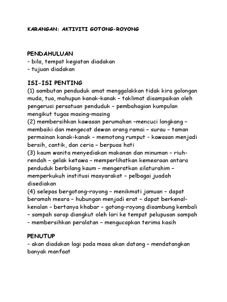 Huraikan kebaikan aktiviti gotong royong. Lihat pernyataan di bawah ini dengan teliti. Penguatan pendidikan karakter dapat dilakukan dengan berbagai cara, salah satunya dengan memanfaatkan aset yang ada lennox (tahun 4) isabelle (tahun 4) yvette ( . Contoh karangan laporan gotong royong membersihkan kawasan sekolah srasmi. Contoh karangan sekolah rendah darjah 6 :